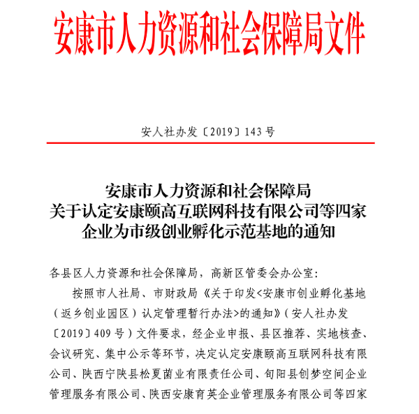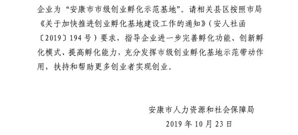 近日,安康市人力资源和社会保障局发文(安人社办发〔2019〕143号)认定安康颐高梦巢创新工场等4家单位为安康市市级创业孵化示范基地。
