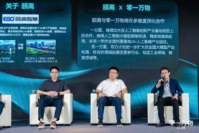 随后,在沈鹏飞主持的“共赢生态”圆桌论坛上。行业生态伙伴金扬与四位生态伙伴代表共同展开深度对话。金扬表示,在AI时代,产业园区是技术赋能实体经济的最佳试验场和应用场。颐高集团深耕产业园区三十年,拥有覆盖全国的200余个产业园区,落地有赣江新区人工智能产业基地、沈阳人工智能产业园等多个标杆项目,具备深厚的资源积累与实战经验。我们选择与零一万物合作,正是看中其领先的万智2.0平台技术实力和对政企场景需求的深刻理解。作为生态共建伙伴,颐高将致力于把零一万物先进的AI大模型能力注入到颐高运营的各大产业园区中。