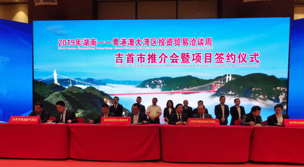 2019年湖南—粤港澳大湾区投资贸易洽谈周(以下简称洽谈周)于4月15日至19日在深圳、香港、澳门及珠三角其他地区举行。期间,湖南邵阳对接粤港澳大湾区重点产业项目推介会在深圳彭年酒店举行。湖南省商务厅副厅长李心球,省政府驻深圳办事处巡视员于云彩,湘西州委常委、常务副州长向恩明,吉首市委副书记、市人民政府市长李诗兴等领导参加了此次会议,颐高集团副总裁顾鹏受邀出席,并与吉首市人民政府签署颐高吉首梦巢小镇及创业创新项目投资意向协议。
