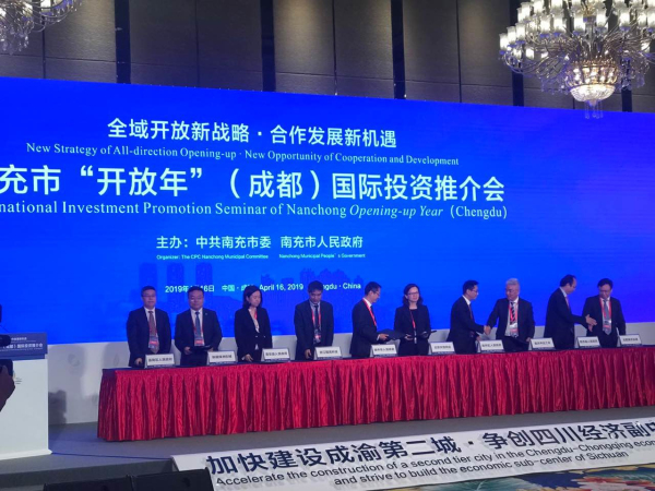 4月16日,在四川省委、省政府举办“2019中外知名企业四川行”系列活动之际,南充市“开放年”(成都)国际投资推介会在成都环球中心天堂洲际饭店举行,包括颐高在内的来自境内外知名企业、商协会组织负责人共计300余人应邀参加投资推介会,共商发展、共享机遇、共绘未来。颐高新经济副总裁戴金星出席本次会议,并作为代表与南充市蓬安县人民政府签署康养小镇投资意向协议。